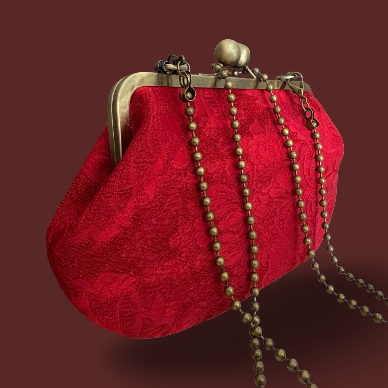 É una piccola clutch realizzata in broccato rosso.