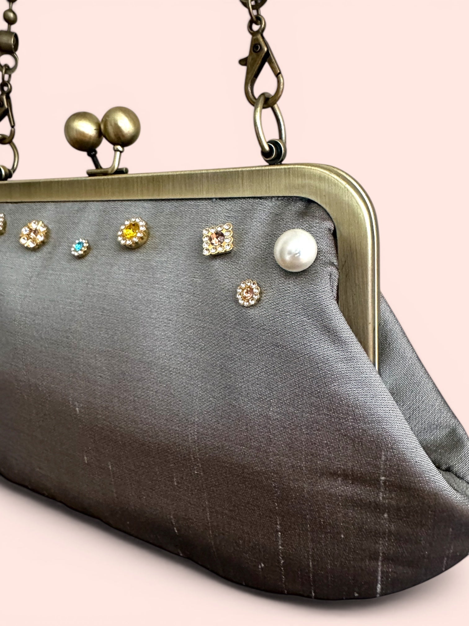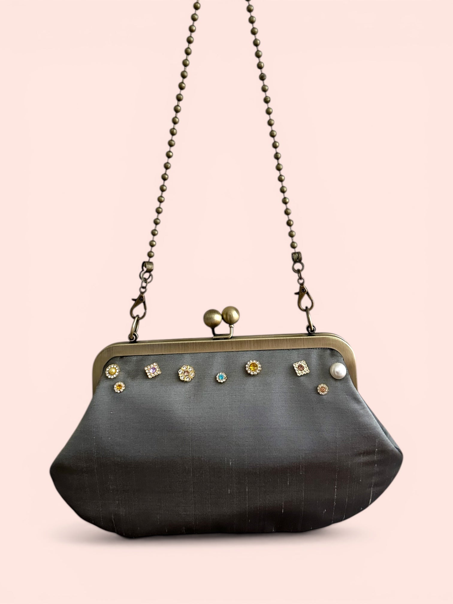 É una piccola clutch realizzata in shantung di seta arricchita da nove piccole borchie gioiello..