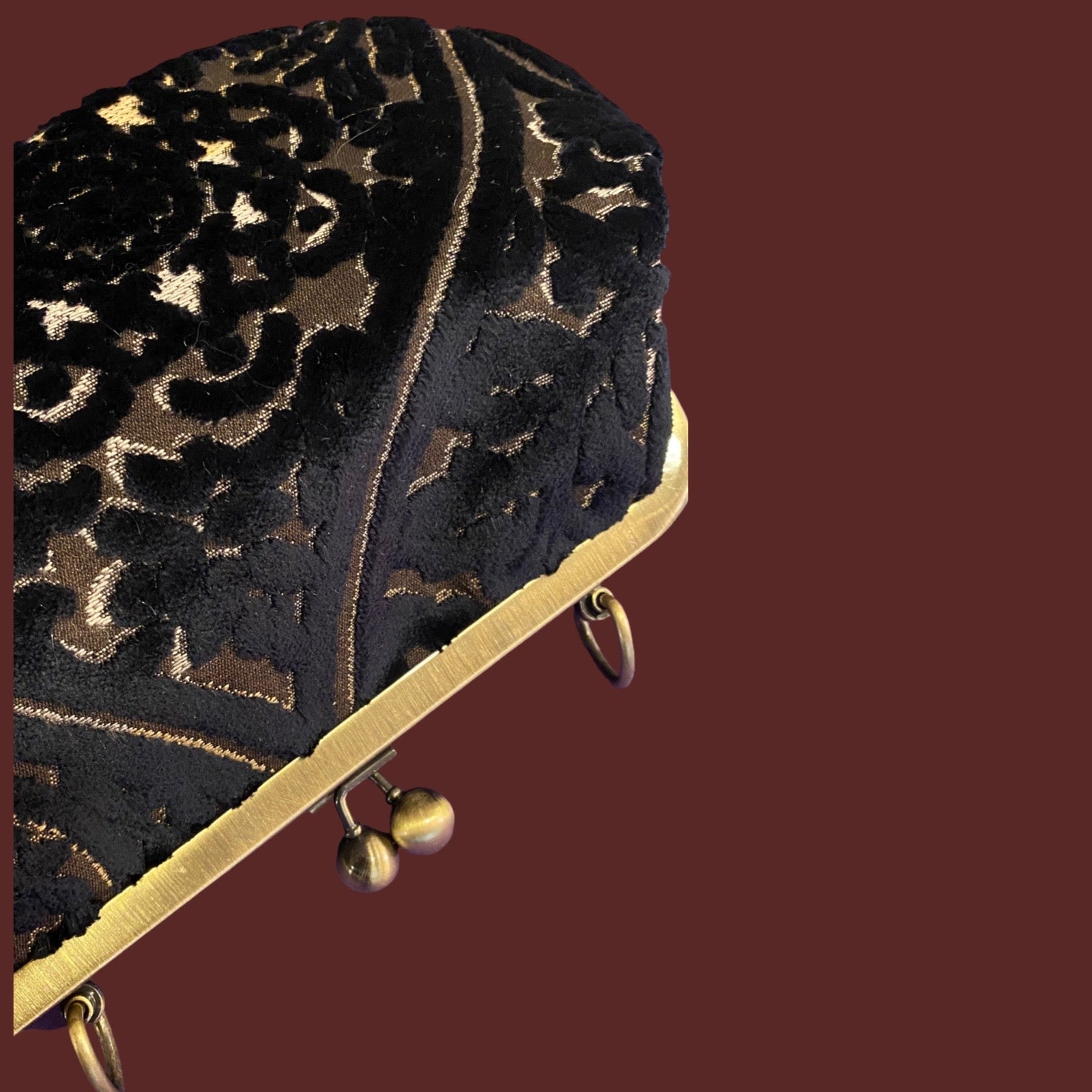É una piccola clutch realizzata in tessuto arredo decorato in stile ‘800 nei toni del nero.