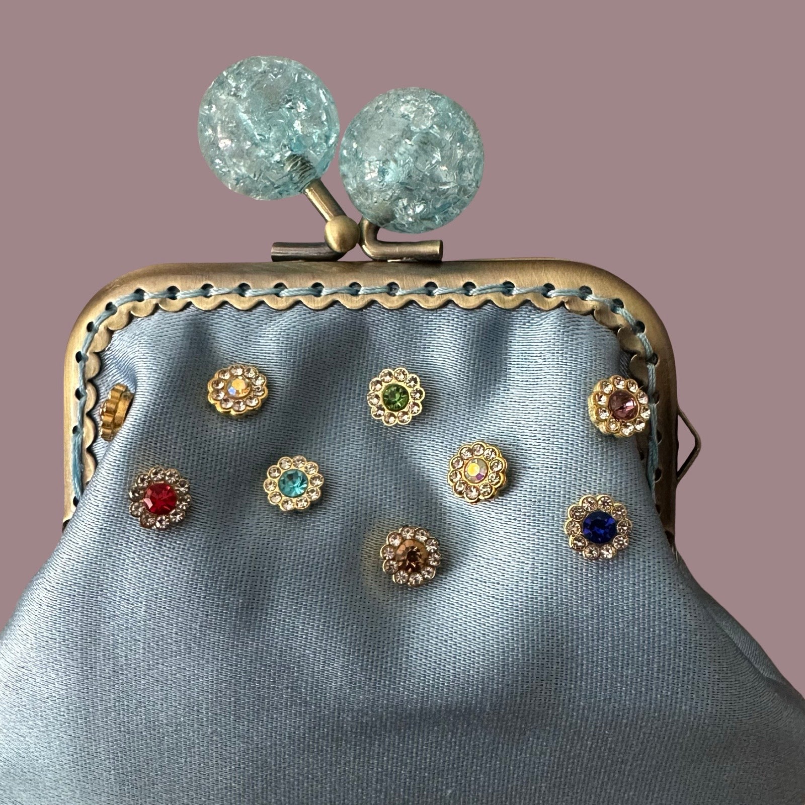 Versione rotonda dello scrigno, realizzato in raso arredo e piccole borchie applicate a mano come gioielli.