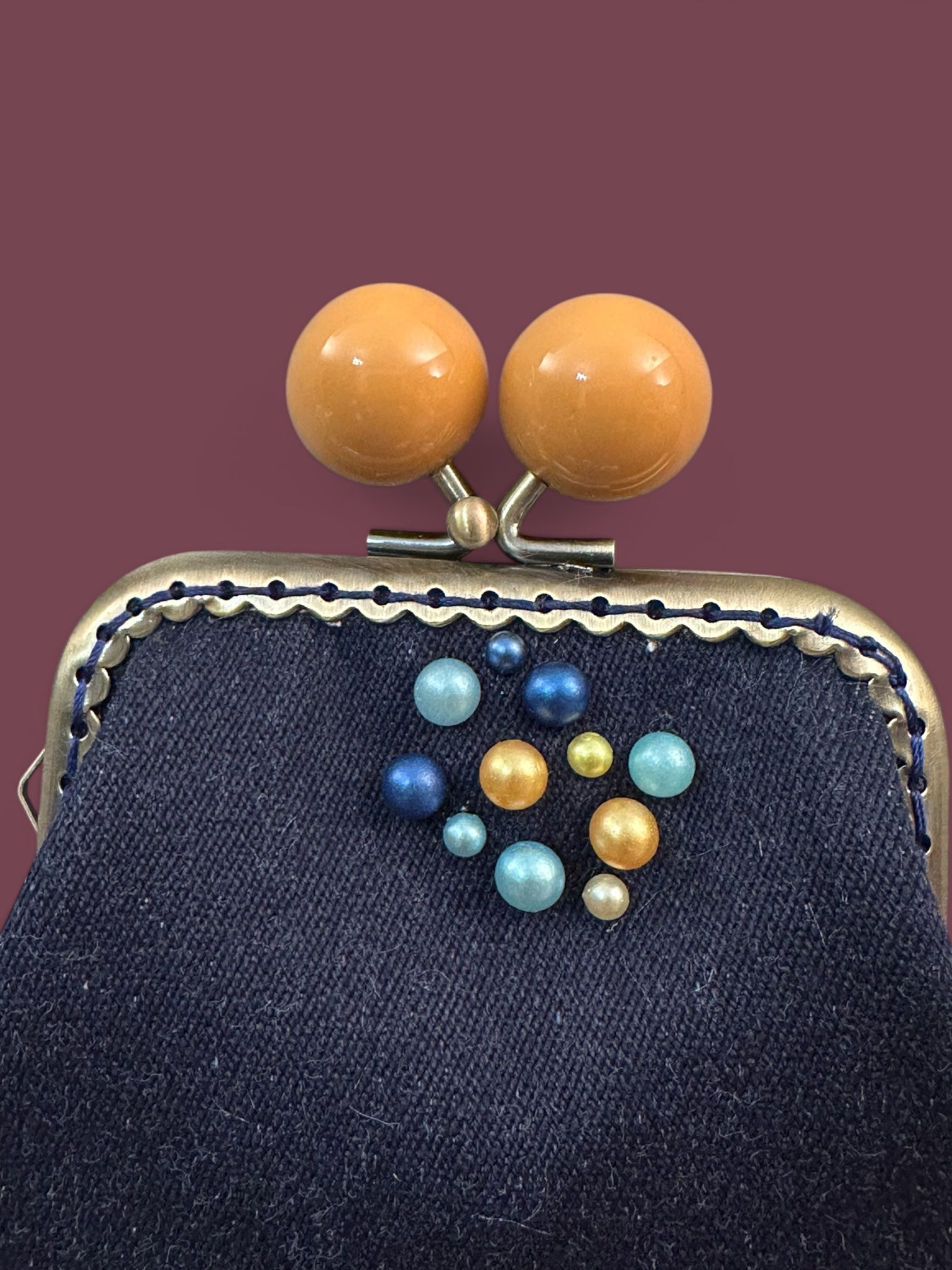 Versione rotonda dello scrigno, realizzato in denim profondo e piccole decorazioni colorate.