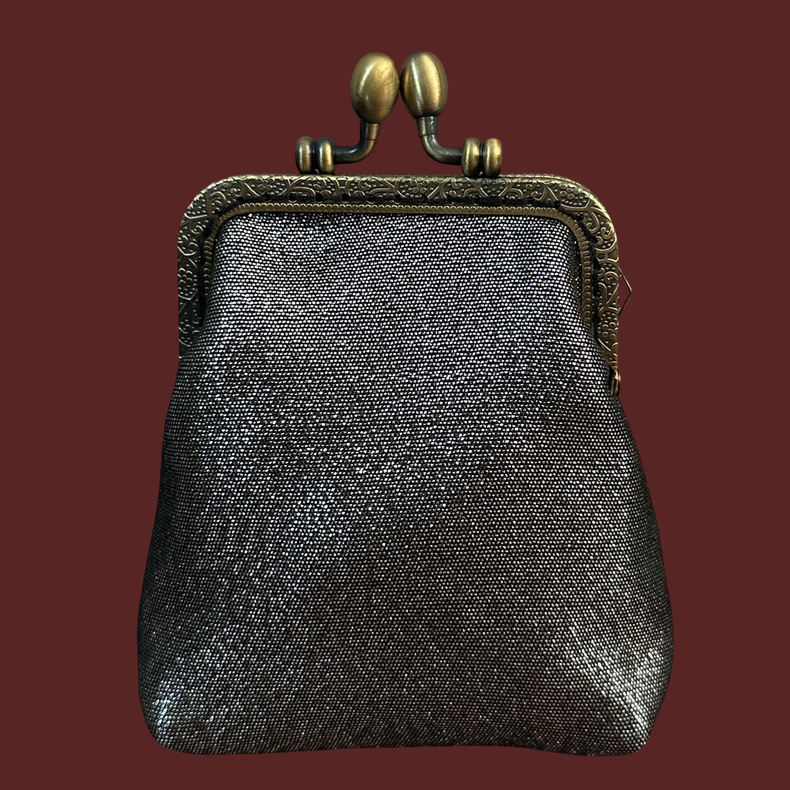 Versione squadrata dello scrigno, realizzato in tessuto arredo grigio scuro metallizzato.