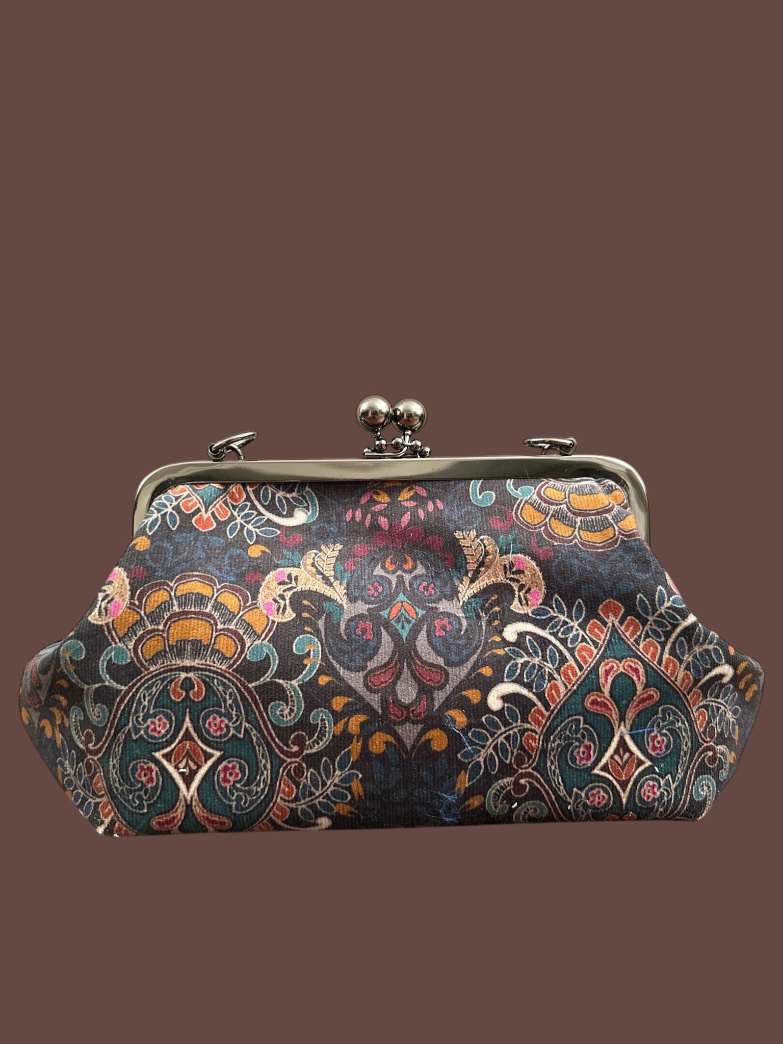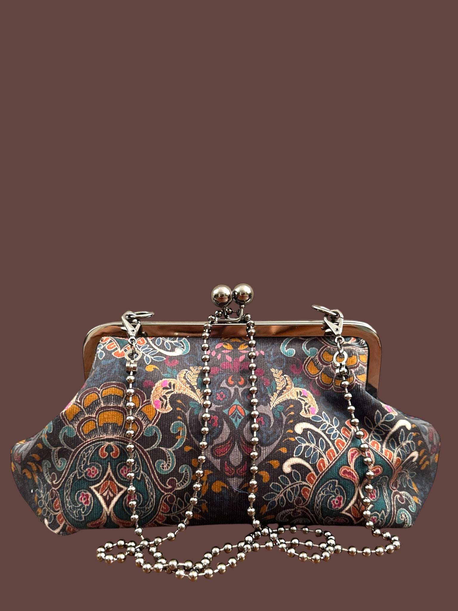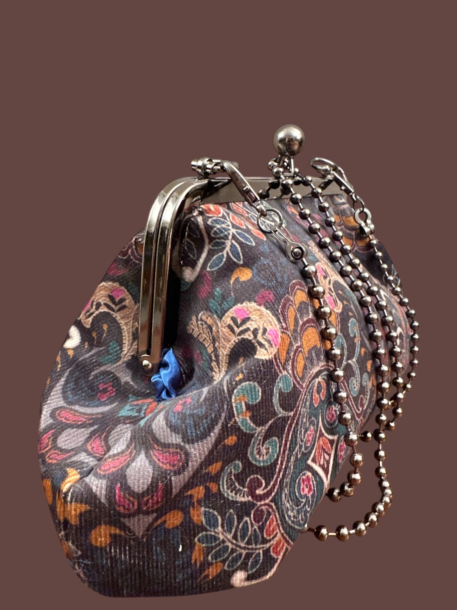 Clutch realizzata in velluto a costine blu arricchito da disegni dal colore appena accennato.