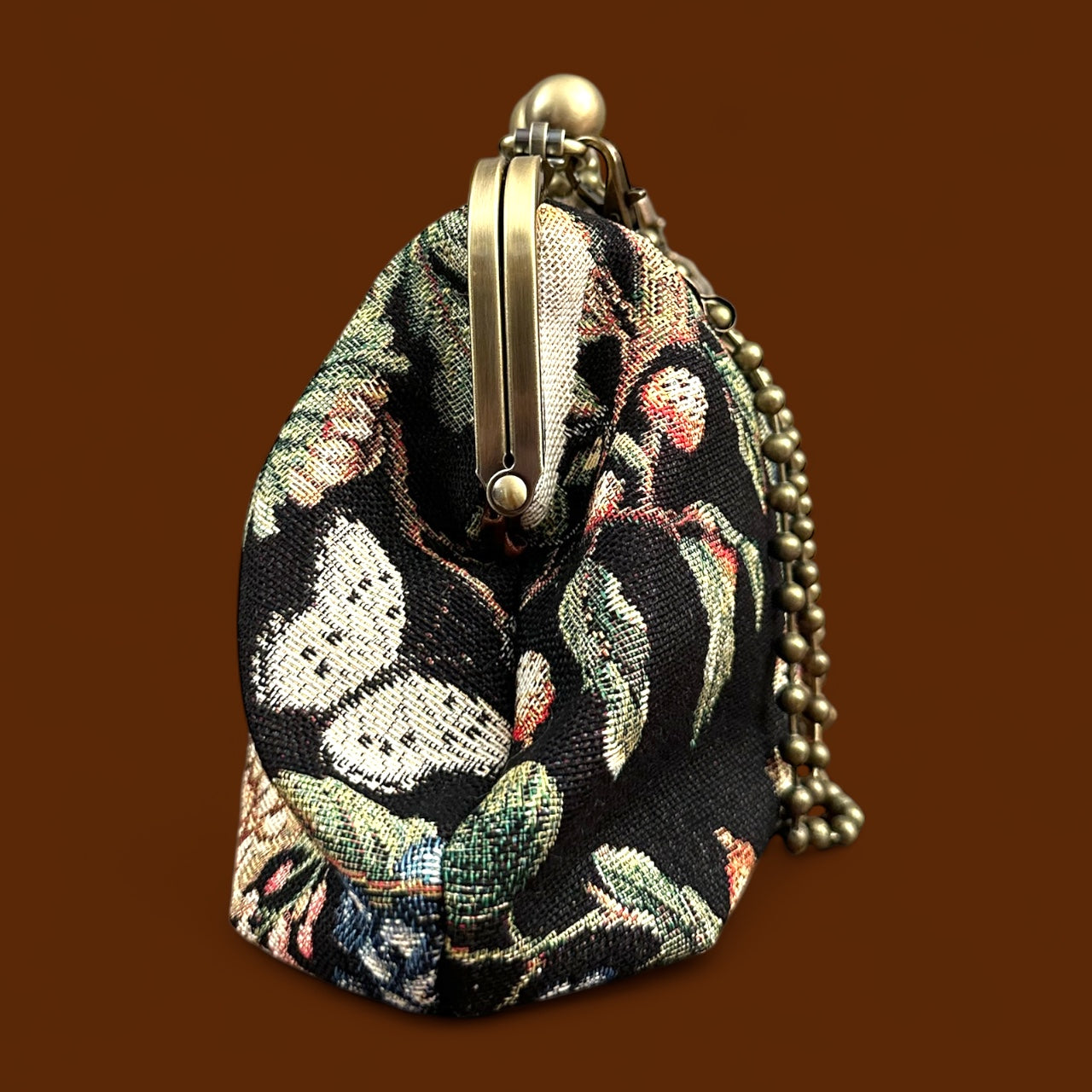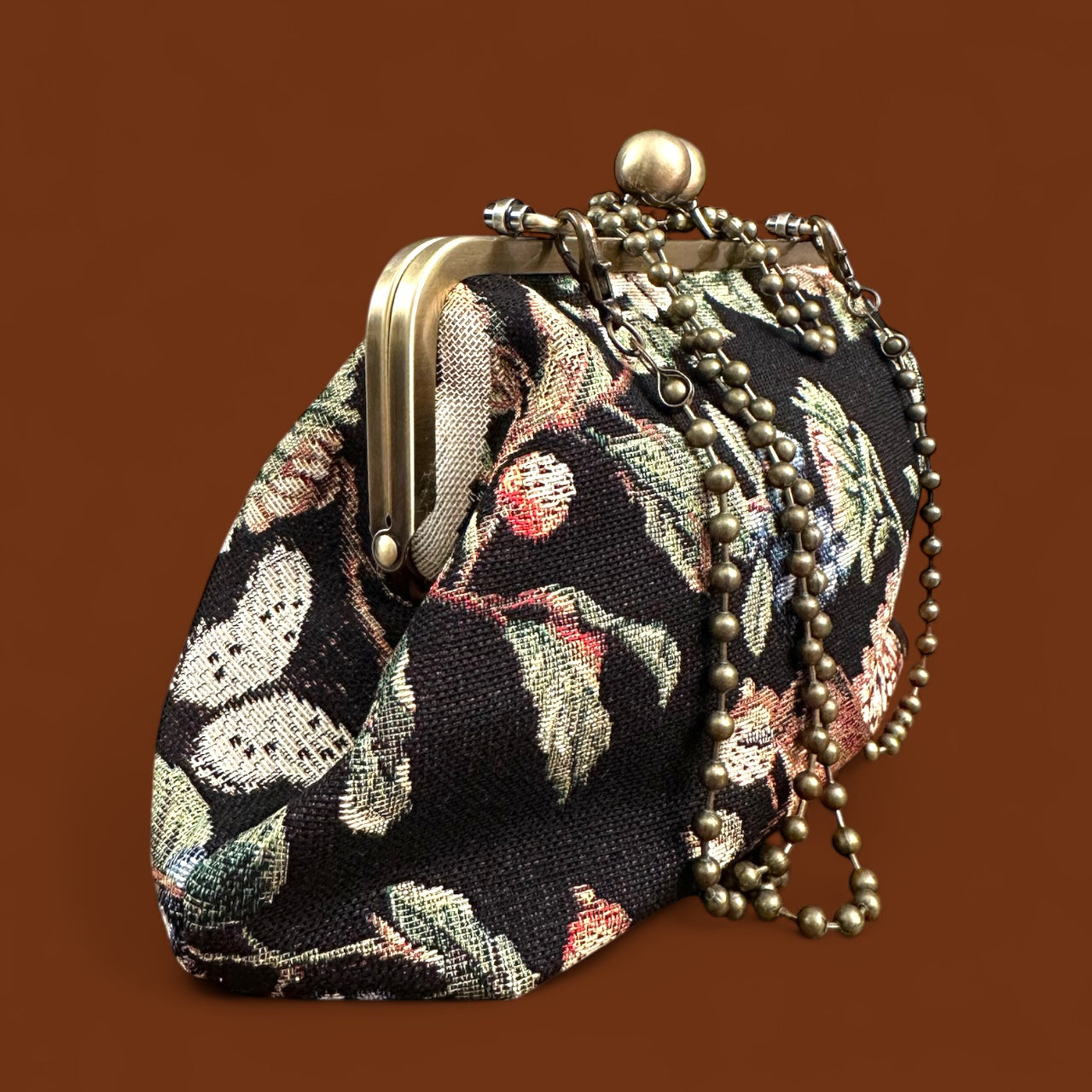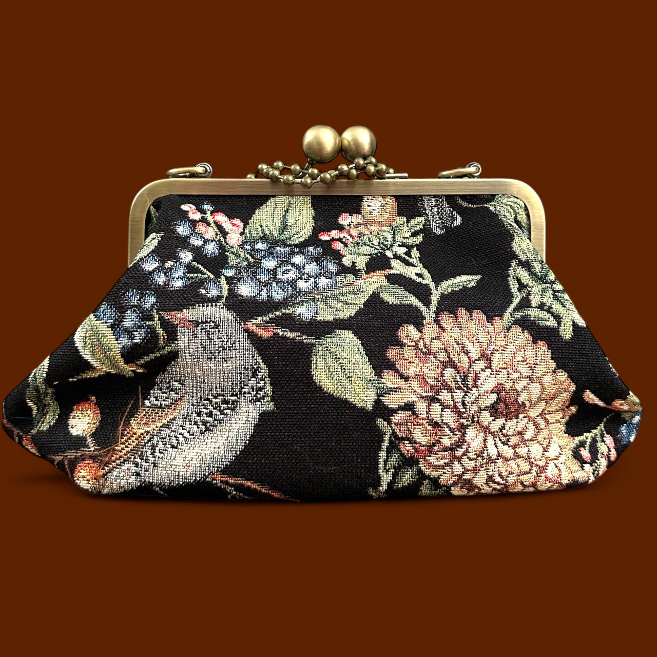 Clutch realizzata in Gobelin con immagini floreali e dolci volatili. L’immagine nella sua totalità è profonda, in armonia con le giornate autunnali ma alleggerita e addolcita da forme e personaggi quasi magici.
