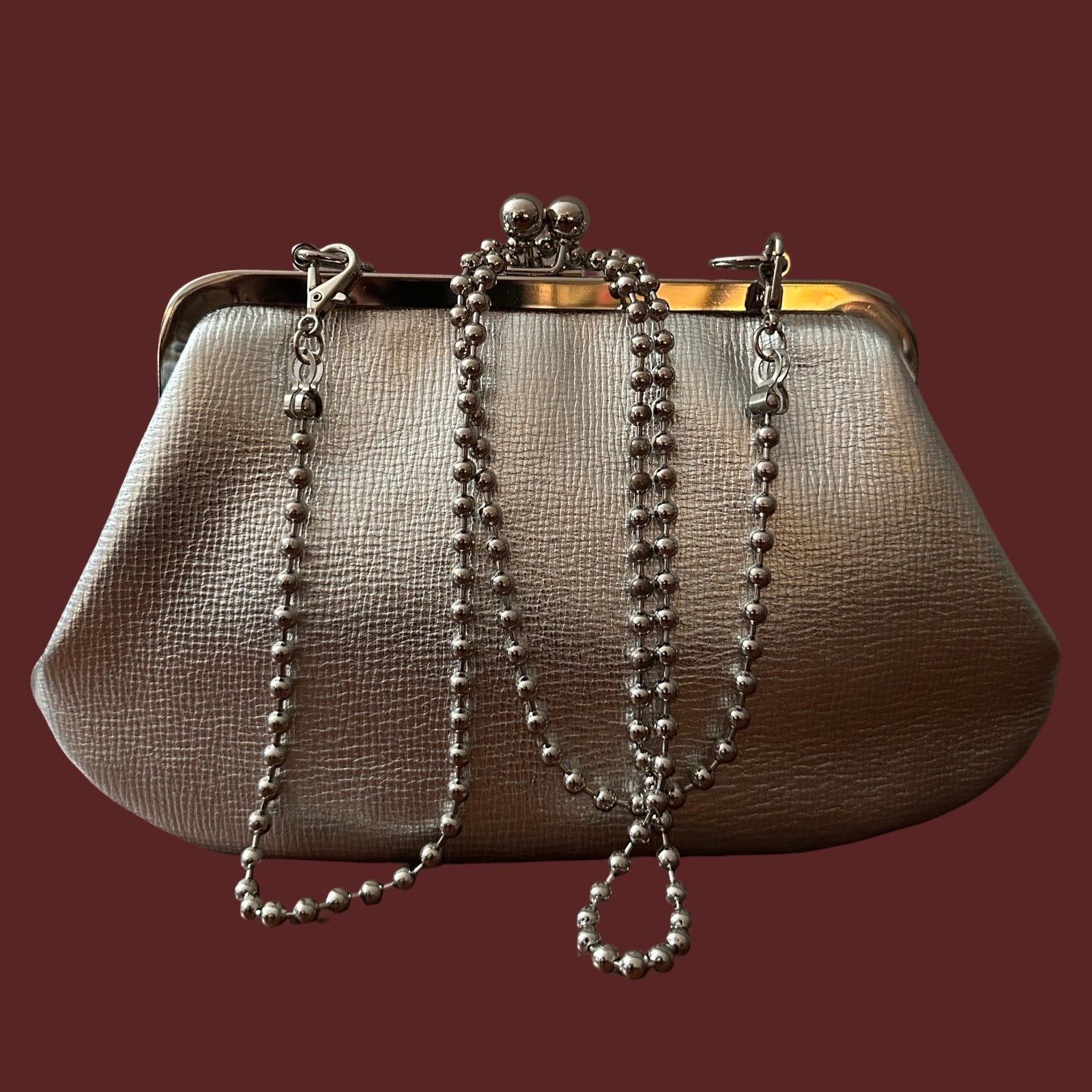 É una piccola clutch realizzata in pelle italiana leggermente rigida argento.