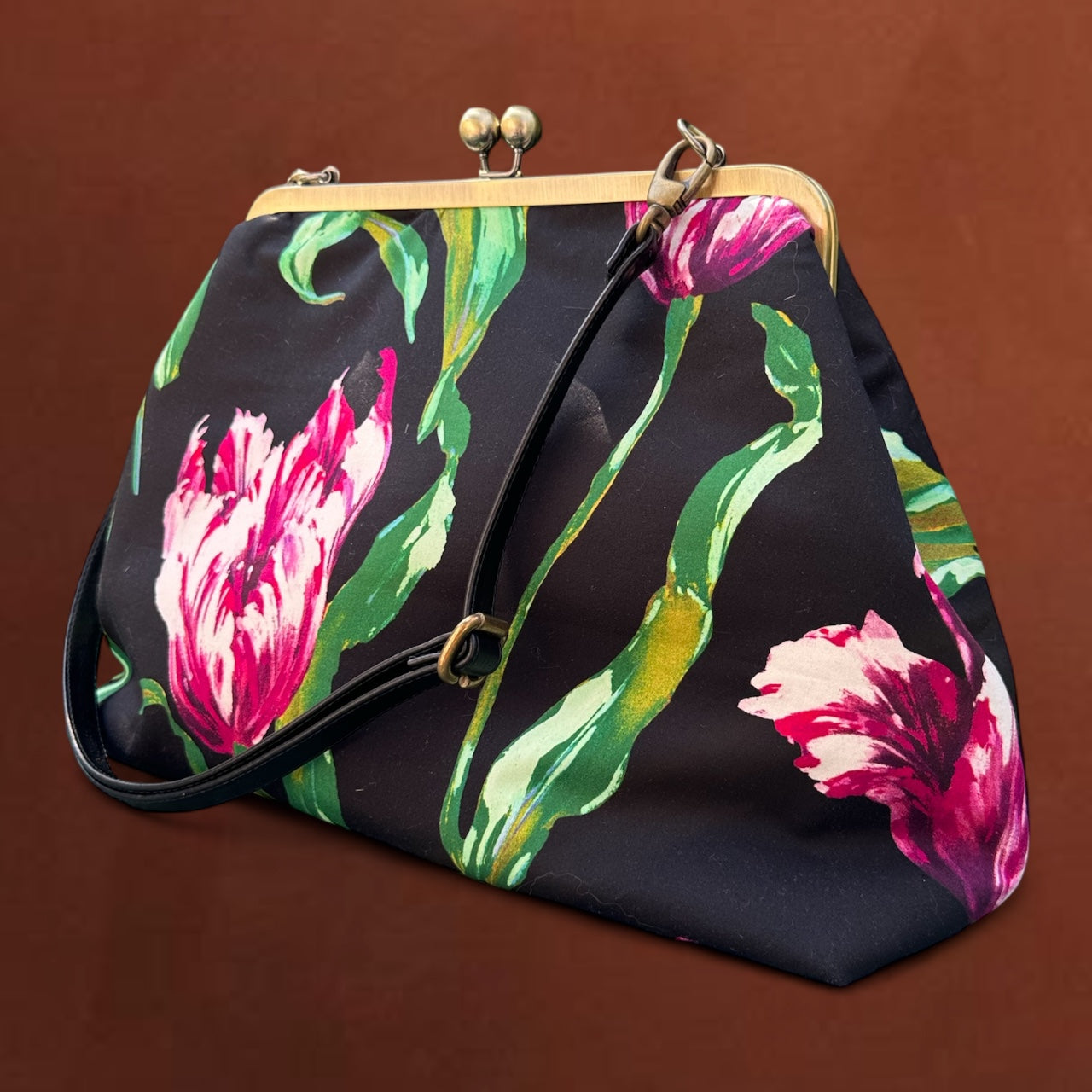 Chiusura a scatto in bronzo con sfere.Tracollina in pelle nera.