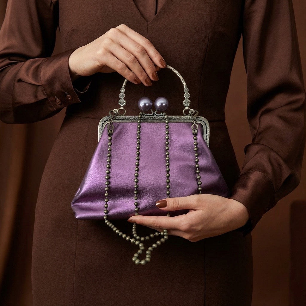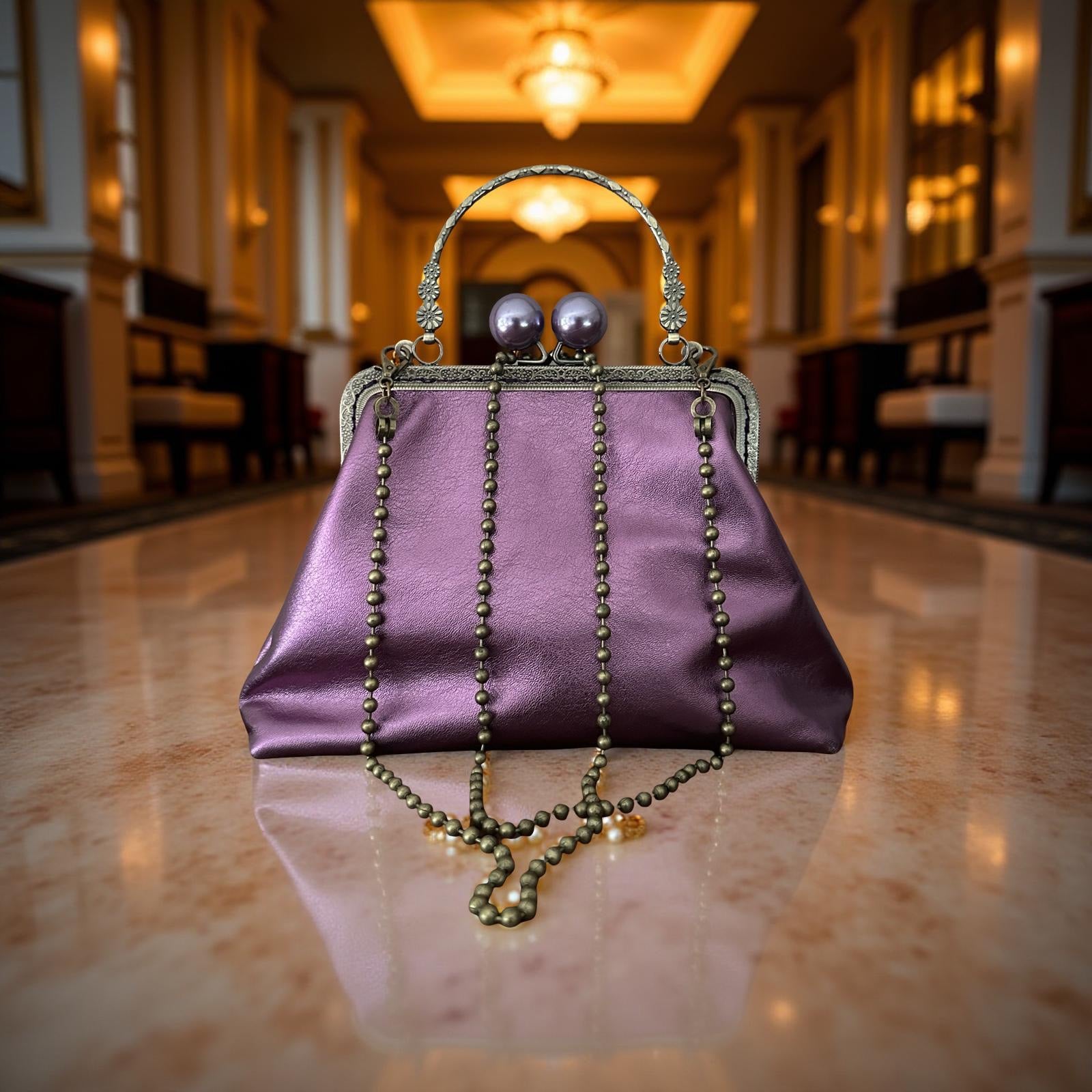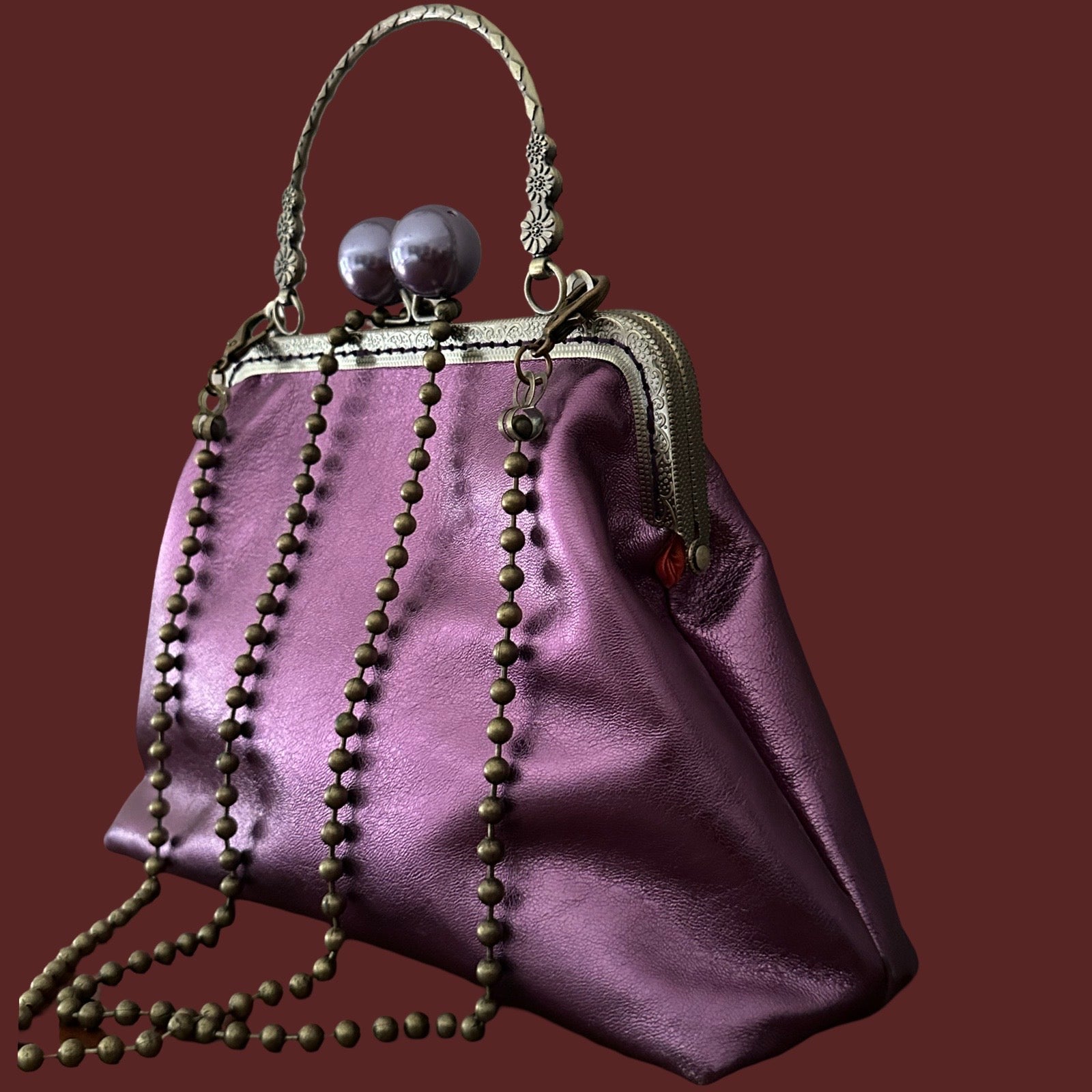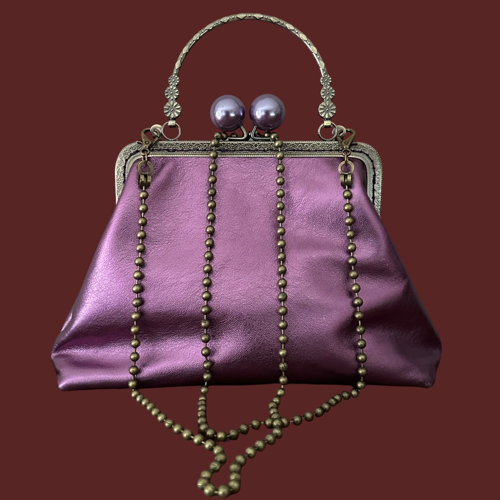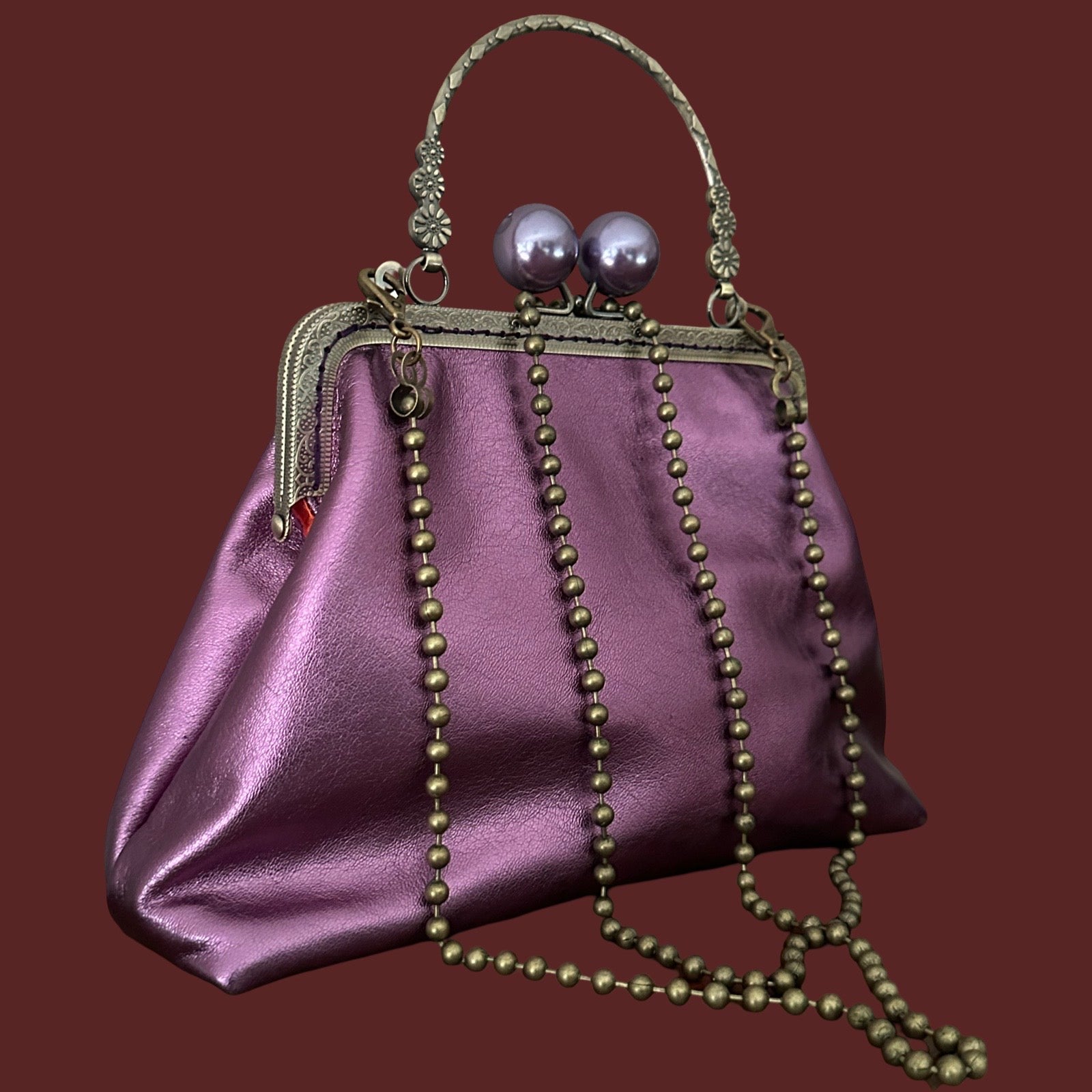 Ha la chiusura a borsellino in bronzo con pomoli big viola profondo, è dotata di tracollina in bronzo con micro sfere lunga 120cm.