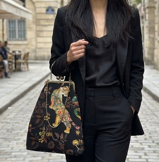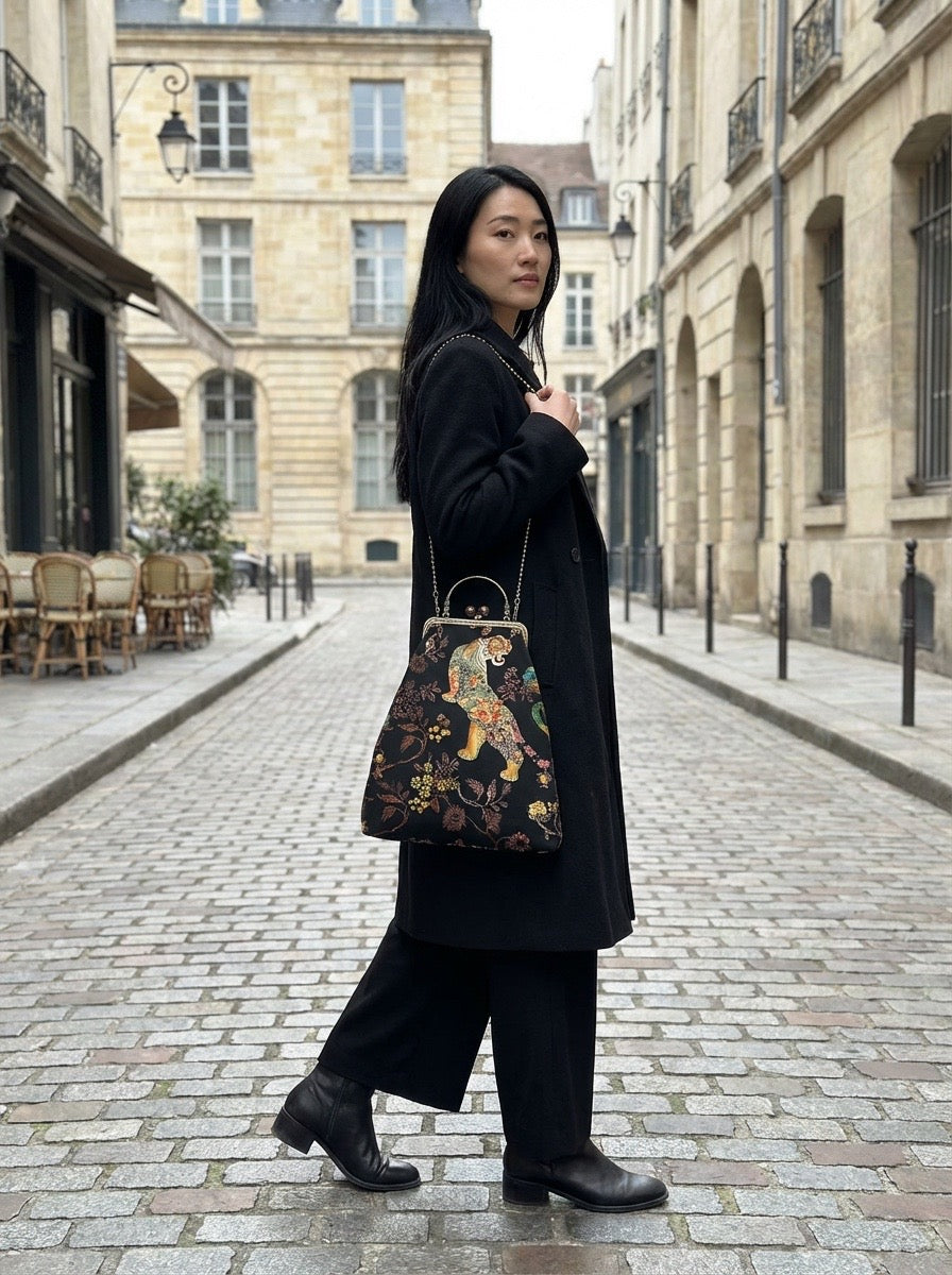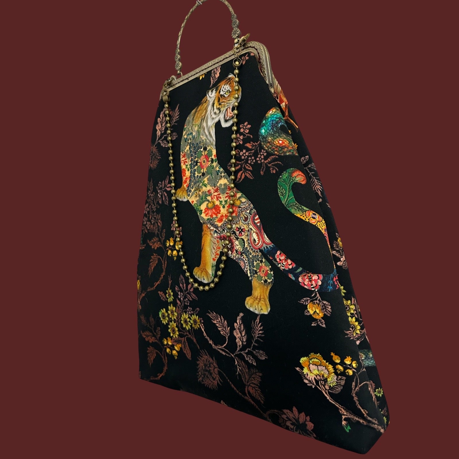 Da indossare a mano, è realizzata in cotone arredo, produzione esotica di un noto marchio d’élite del mondo dei tessuti italiano.