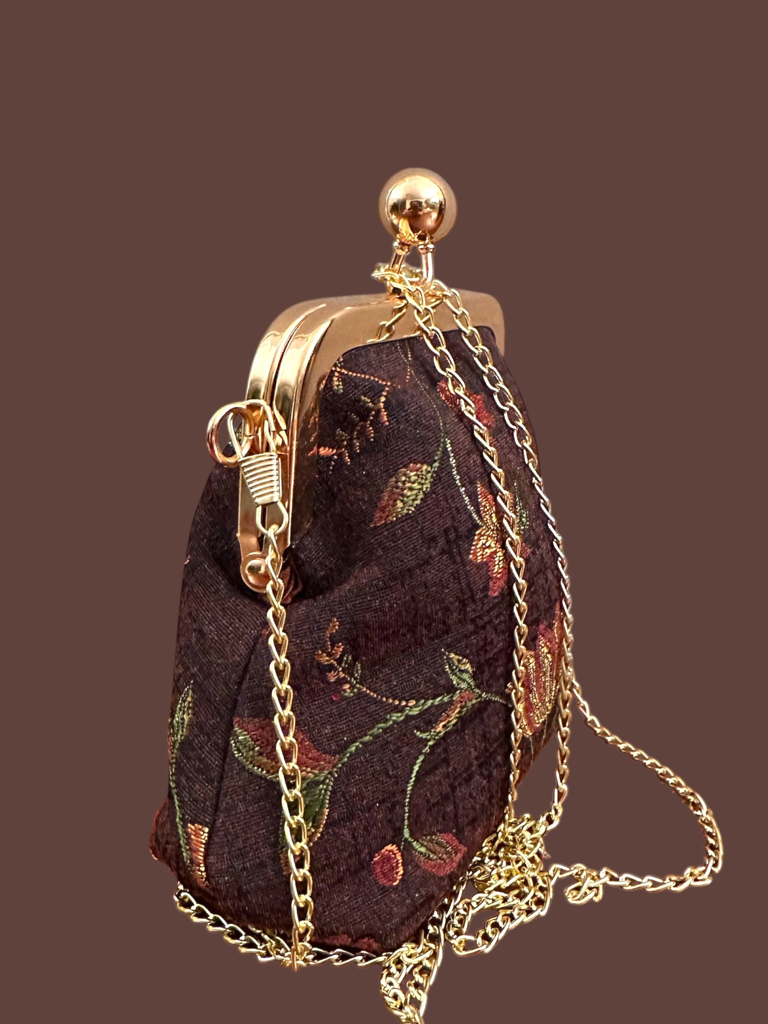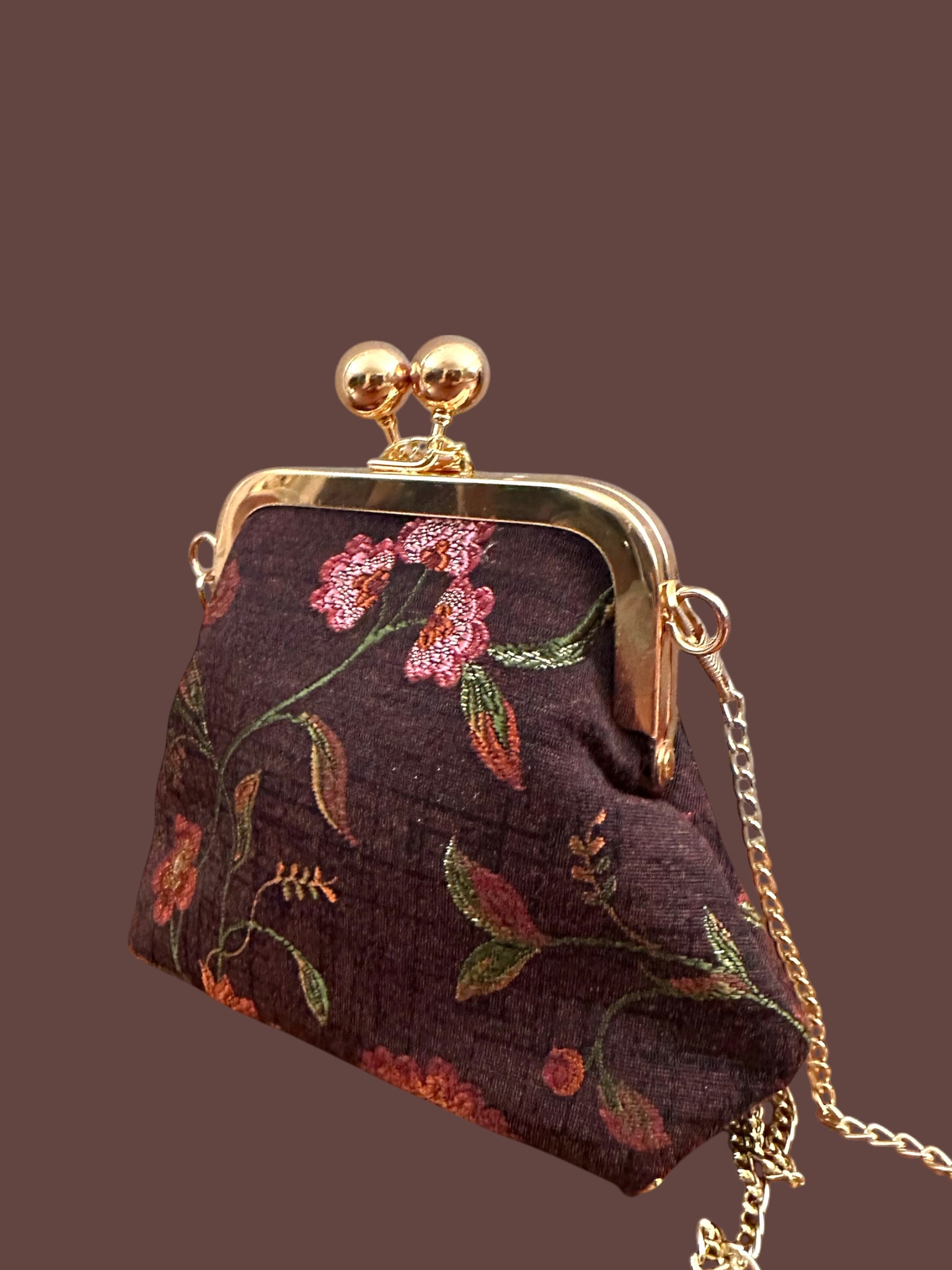 Mini pochette realizzata in lana ricamata con immagini floreali. Una mescolanza di toni femminili e dolcissimi su un tappeto color bruciato.