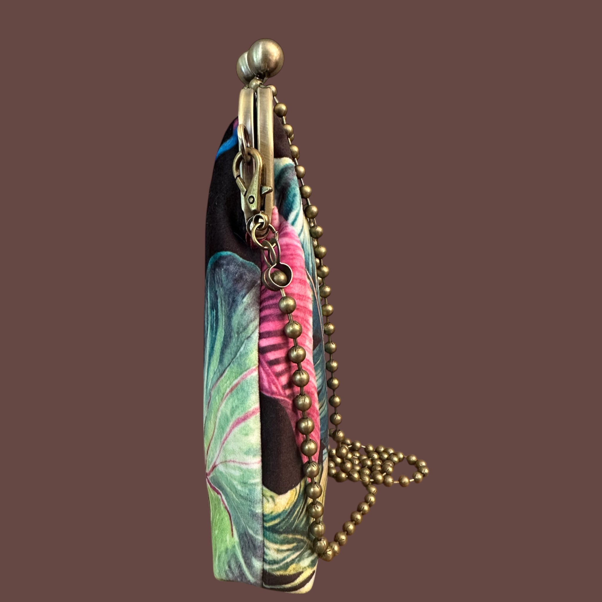 Realizzata con la chiusura a scatto in bronzo e la sua tracollina indossa un velluto leggero nero nella Giungla.