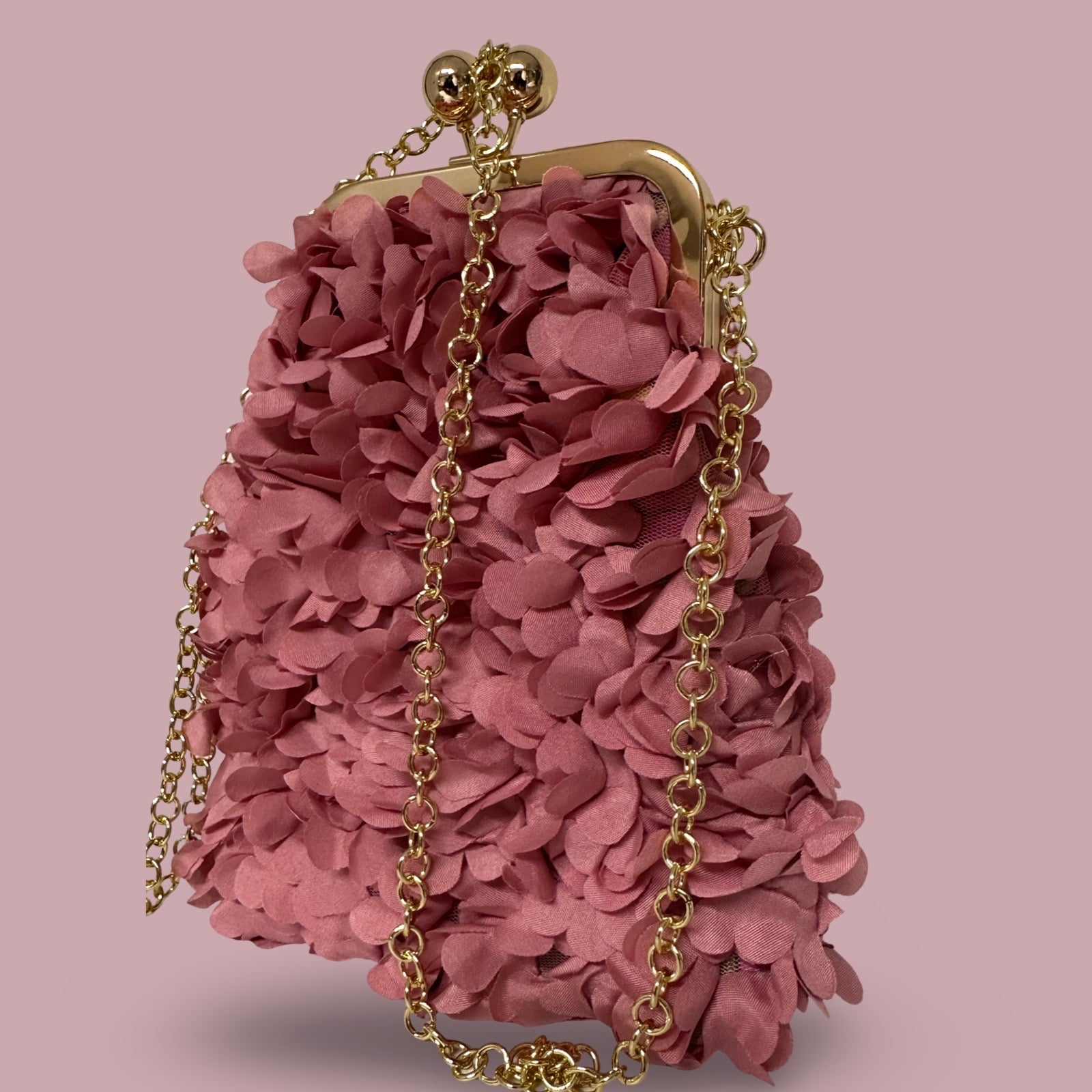 Realizzata con la chiusura a scatto oro e la sua tracollina indossa un tulle rosa in 3d, un prato in tessuto leggero e primaverile.
