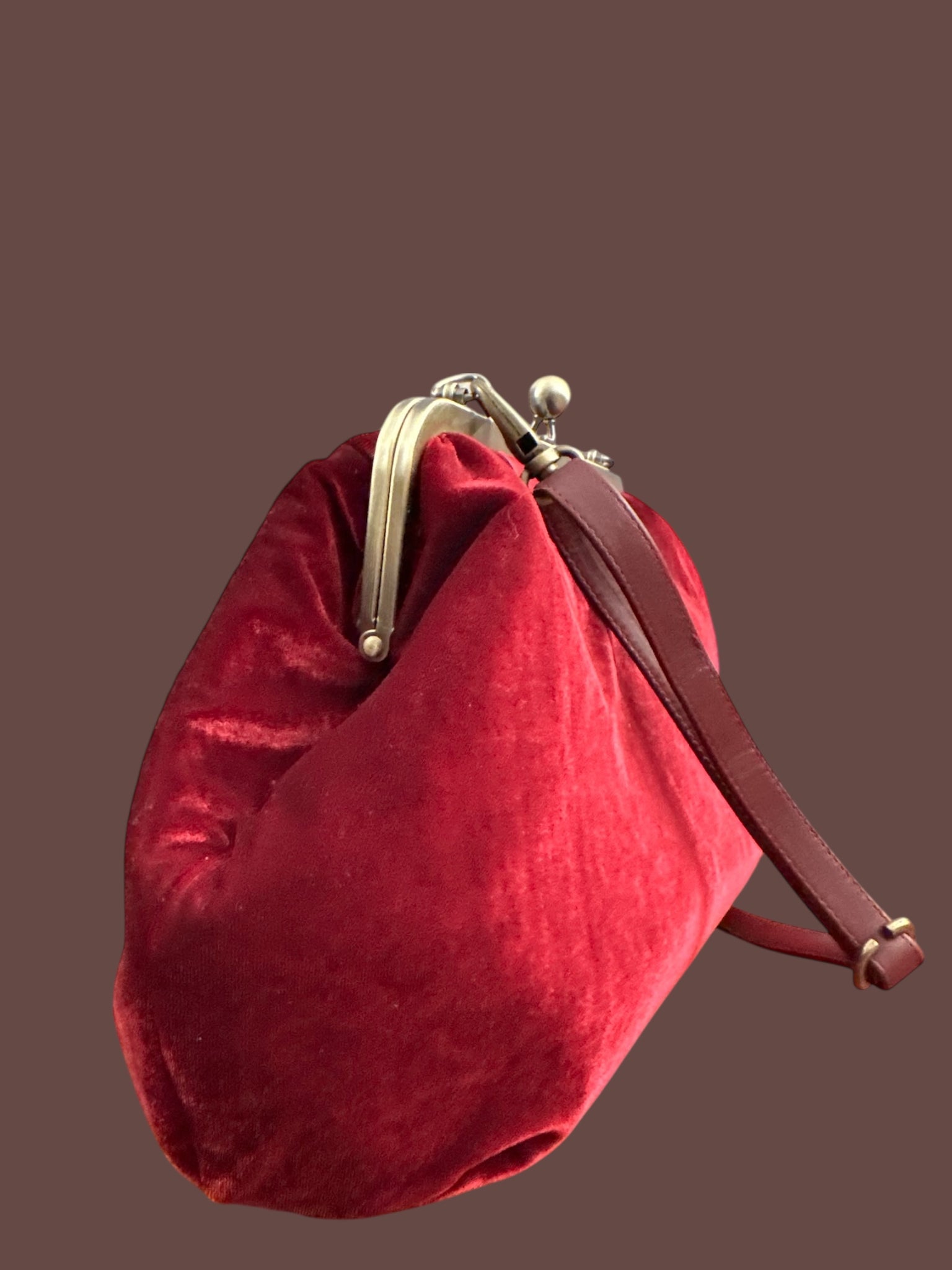 Chiusura a scatto in bronzo con sfere.Tracollina in pelle bordeaux.